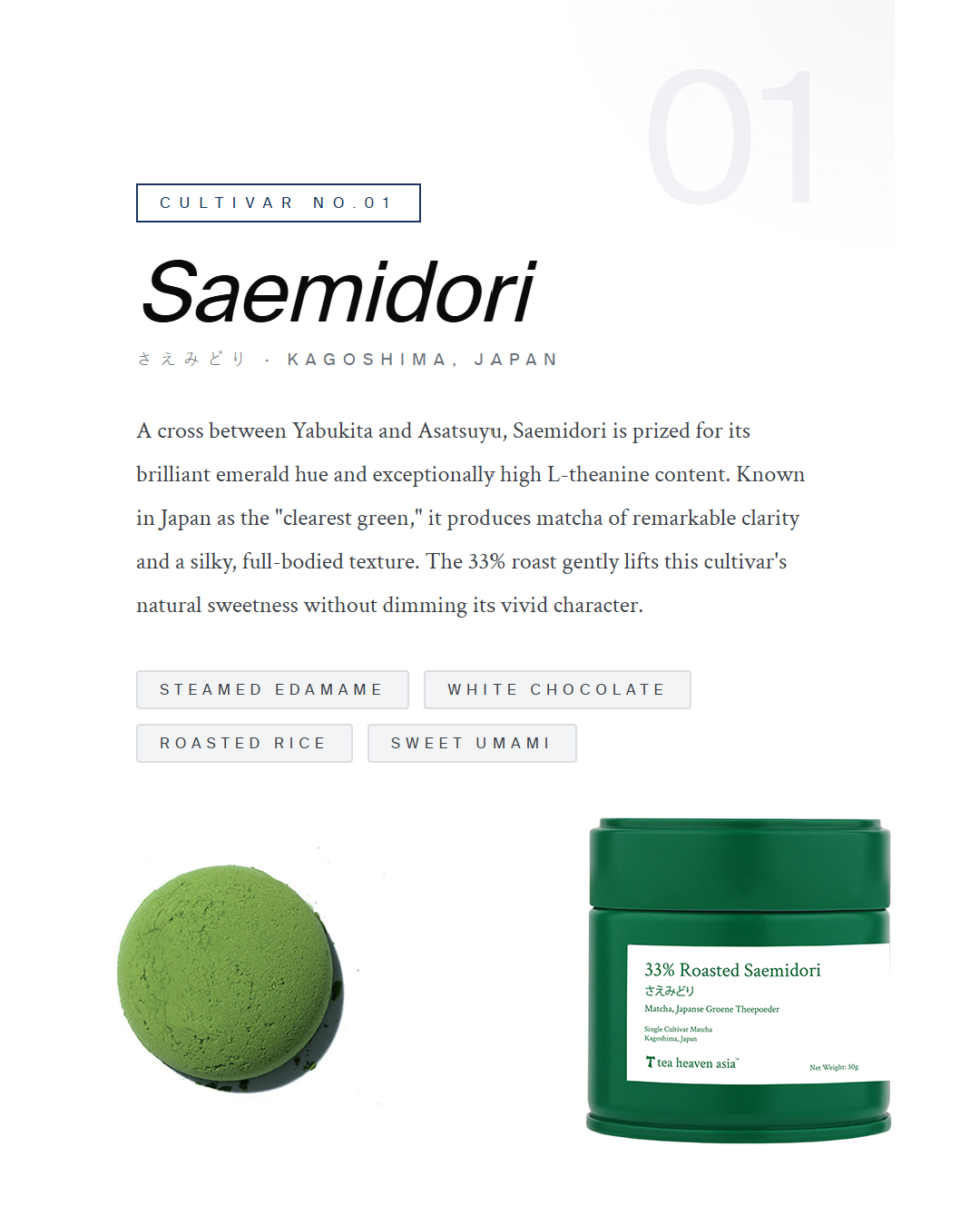 A cross between Yabukita and Asatsuyu, Saemidori is prized for its brilliant emerald hue and exceptionally high L-theanine content. Known in Japan as the “clearest green,” it produces matcha of remarkable clarity and a silky, full-bodied texture. The 33% roast gently lifts this cultivar’s natural sweetness without dimming its vivid character.