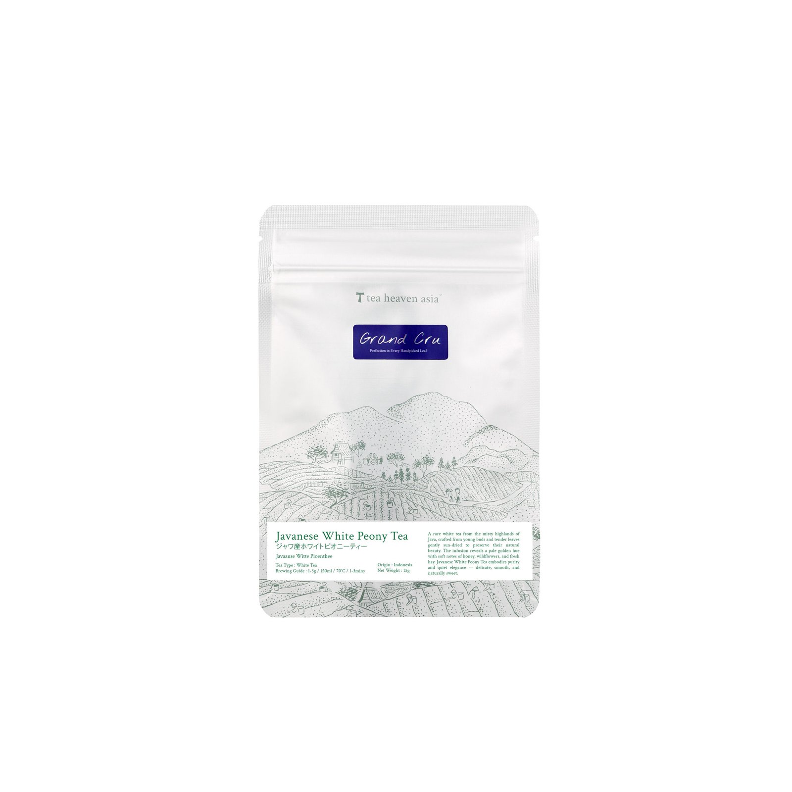 White Peony, or Bai Mu Dan, is a refined white tea crafted from tender young leaves and unopened buds, gently harvested from the cool, misty highlands of West Java. Inspired by the traditional style of classic Chinese white teas, this West Javanese expression reflects a softer tropical elegance shaped by volcanic soil and mountain air.